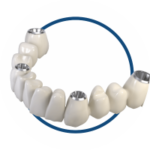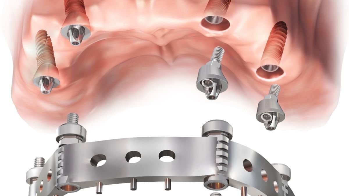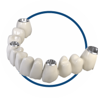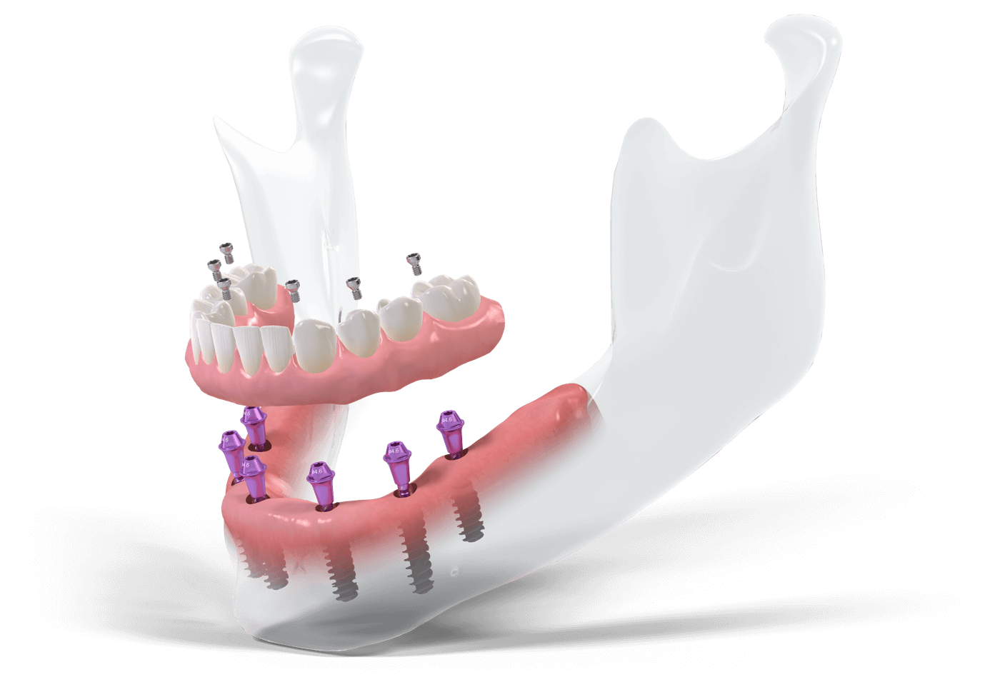 Данная технология подразумевает установку четырех либо шести опор с последующей фиксацией на них протеза. Это самое надежное и долговечное решение при необходимости тотального восстановления зубов при полной адентии.